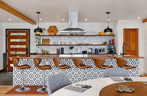 You’ll find state-of-the-art appliances, kitchen gadgets, a 6qt Instant Pot, nonstick ceramic pots and pans, silverware, glassware, and anything else you’d ever need to whip up a decadent meal for the whole group. You’ll also find a premium coffee and tea bar, farm-fresh local eggs, and pancake mix so you’ve got breakfast covered. Enjoy your meals at the elevated breakfast bar made of Sapele wood, or at the 10-seater round dining table with a lazy Susan.