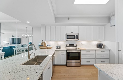 Your next steps bring you to the completely renovated kitchen. Set your keys down on the beautiful new quartz countertop that is embedded with recycled glass that matches the colors of the Gulf. The kitchen is stocked with all brand new stainless steel appliances including a convenient beverage fridge. The brand new cabinets are stocked with……well, pretty much everything your family will need. There is plenty of useable counterspace for your needs. The counter peninsula was lowered to counter height that includes 4 barstools to allow for family time together during meal and snack prep time. The best part of the kitchen is the view. A mirrored great room wall gives you an expansive view of the water that includes the iconic Navarre Pier.