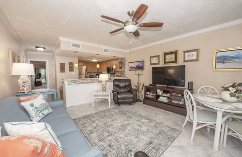 Your stay at Salty Breezes is enhanced by a wealth of amenities, including an expansive layout of 810 sq. ft., cozy furnishings, and a well-equipped kitchen perfect for romantic dinners. Relax in the comfortable den area, complete with a 50-inch TV, or unwind on the spacious balcony while basking in the sun's glow. The king-sized bed promises restful nights after wedding festivities, while the proximity to local attractions means you can enjoy delightful seafood dining at Angelo's Restaurant, just steps away from your door.