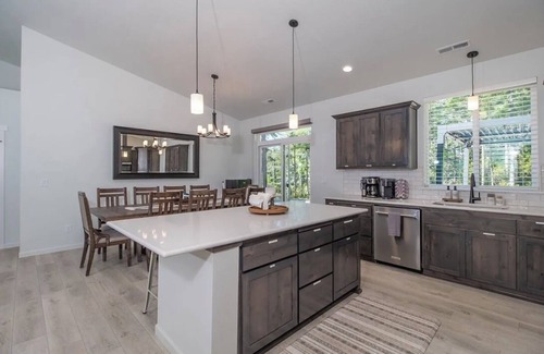 The dining room has a dining table for 10 and 5 bar stools up at the island and a mini fridge for extra drinks.