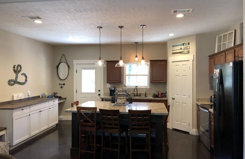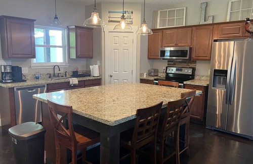 The kitchen is equipped with everything you need. The gas grill and electric smoker are located on the back porch with outdoor seating. The front porch has seating or 4 and a gas fire pit for your enjoyment.