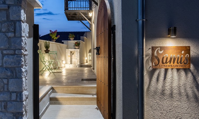 In a stone cobble path Samis LuxuryLiving suites provide a smooth transition between traditional and contemporary styles, interior and exterior spaces are designed to respond and embrace the unique natural beauty and the traditional architecture of mount Pelion.