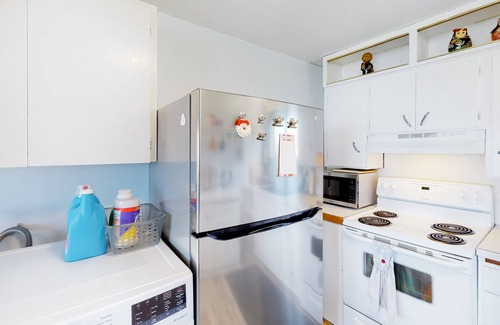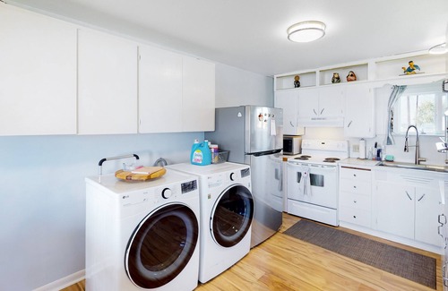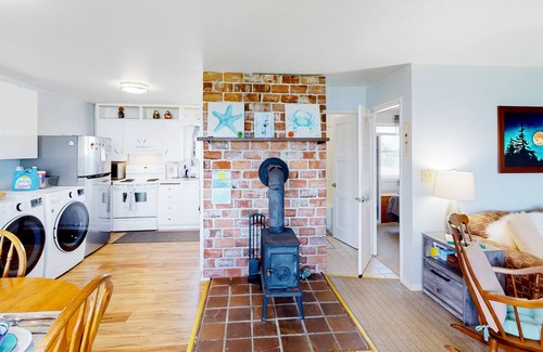 The single-story interior is open and full of light, with sunshine and water views streaming in through the sun porch. Whether you're preparing a favorite meal in the well-equipped kitchen, sitting down for dinner and board games at the dining room table, or streaming movies by the woodstove in the living room, you'll do it all with a beautiful view of the bay. Complimentary WiFi and a washer/dryer are also on hand for your convenience.