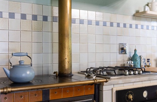 Ground floor: living area made up of kitchen (oven, freezer, dishwasher, microwave, American coffee maker, espresso coffee machine, gas cooktop, wood burning range cooker) with fireplace and dining area with outdoor access; bathroom with shower; utility closet with washing machine