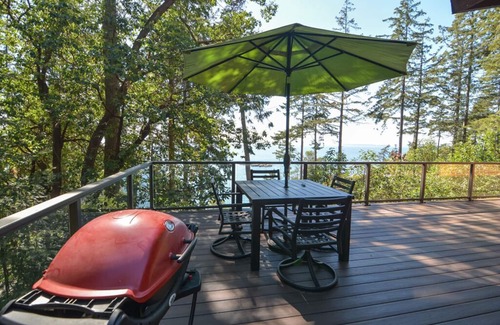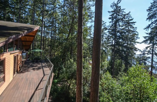 Orca Overlook sits perched on a hillside overlooking some of the most Orca traveled waters in Haro Strait and the Salish Sea. A brand new large deck, surrounded by trees, gives one the feeling of being in a tree house. After you watch the sunset over Vancouver Island in the distance, move indoors to the cozy living room to stream Fire TV (no satellite reception). The home features large windows that look out over the sea, so bring your binoculars.