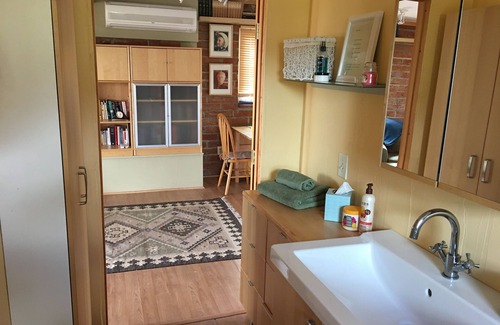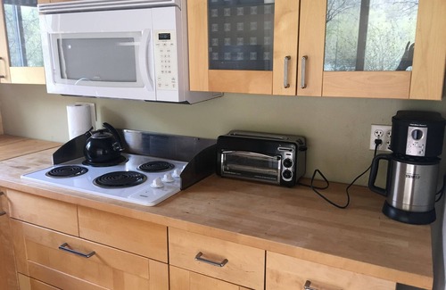 The cottage features modern amenities while retaining its original charm, ensuring a comfortable stay for you and your guests. Enjoy the well-equipped full bathroom and kitchen amenities, including a stovetop, microwave, and coffee maker. The sandstone patio invites small gatherings, allowing you to host memorable moments outdoors, whether it's a casual brunch or a quiet meditation session amidst nature. Highlights include free WiFi, heating and air conditioning, and a cozy library filled with eclectic books on inspiration and self-guidance. Additionally, embrace the tranquility of the outdoor seating areas, where you can soak in the breathtaking panoramic desert views that surround you.