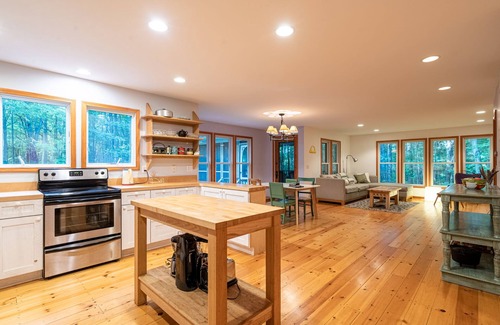 Its warm, uncluttered interior boasts gorgeous amber pine floors (great for allergy sufferers!) and an open living and dining area, with a breakfast nook. But the real star of the house is the spacious screened porch, completely surrounded by forest. Ahhh.