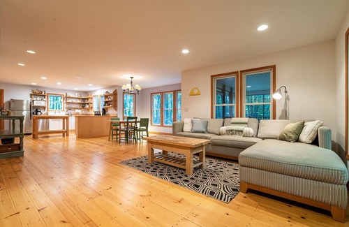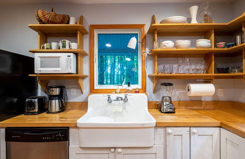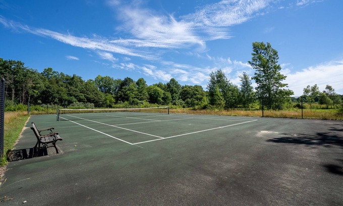 Feeling sporty? The house has its own tennis court (and rackets), great for tennis of course, but also soccer, skating, and goofing around. There are lawn games and various beachy things, and since Glenn's little-visited beach is just a half-mile walk on a private path through the woods, you'll be needing them. (You can also drive to the beach – parking is usually available and always free.) The beach is rocky, however, so water shoes are strongly recommended. When you get back, the outdoor shower awaits, as does a charcoal grill on the patio, a fire ring for s'mores, and a first-rate hammock by the creek.