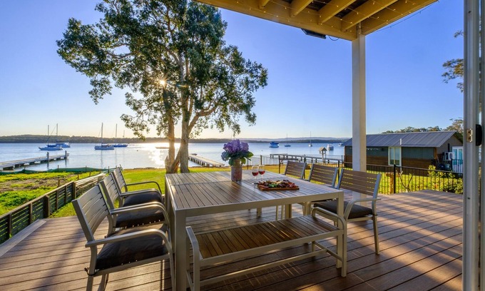 Come and enjoy this freshly renovated, well equipped holiday house right on the waters edge at Mannering Park. Sheltered in a quiet bay just 200 metres from the boat ramp, you can launch your boat or jetski and park it at our jetty just metres from the back door. Enjoy a quiet drink under the stars by the crackling firepit overlooking the lake. Ideal for 4 couples or 2 families looking for a quick getaway just 60 minutes from the start of the freeway at Wahroonga.