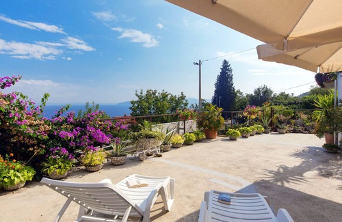 "Sandalj", 3-room apartment 80 m2, on the ground floor. Living room with satellite TV and air conditioning. Exit to the terrace. 1 room with 1 french bed (180 cm). 1 room with 1 french bed (160 cm). Dining room. Open kitchen (dishwasher, 2 gas rings, toaster, kettle, microwave, freezer, electric coffee machine). Bath/WC. Terrace 80 m2. Terrace furniture, deck chairs (3). View of the sea. Facilities: washing machine, iron. Internet (WiFi, free). Please note: non-smokers only. One bedroom with window to the kitchen.
