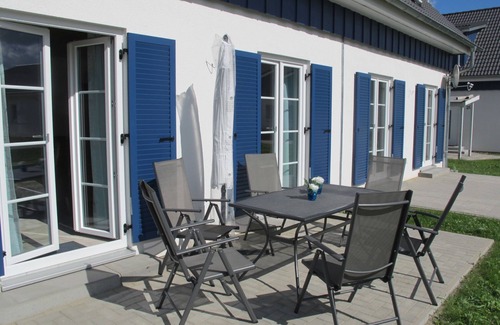 Semi-detached house "Sanddorn", built in 2016. 400 m from the centre of Altefähr, on the outskirts, 6 km from the centre of Stralsund, 36 km from the centre of Binz, 500 m from the sea. Private: property 300 m2 with lawn and wildlife garden, parking (for 2 cars) on the premises. Shop 500 m, supermarket 6 km, restaurant 500 m, bus stop "Bahnhof Altefähr" 2.3 km, sandy beach 500 m, indoor swimming pool 6 km. Marina 500 m. The holiday home's power supply is optimized by its own photovoltaic system with battery storage. A wallbox is available to guests free of charge.