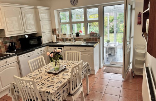 The large, modern and well-equipped dining kitchen has everything you need to cook a great meal, and includes an electric Hob and a new electric double Oven, Fridge/freezer, Microwave, Air Fryer, filter Coffee machine, Dishwasher and Washer/dryer. A door from the kitchen leads into our conservatory, allowing you to enjoy a comfortable alternative to an eating and relaxing area, looking out onto our pretty, private, and secure garden.