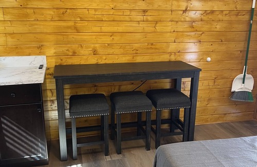Sandstone Cabins are our most basic cabin with the addition of a private bathroom. It has a lot of what you might need except a shower inside of it. They have a single queen bed, heating/AC, mini-fridge, microwave, coffee maker, toilet and sink, Cable TV, WiFi and a table with stools. We have them set up for you with all linens and bath towels included for your stay. We have a bathhouse very close by where you can shower during your stay. Outside the cabin you have a gravel parking spot for your vehicle, a picnic table and fire pit. We have additional parking for extra vehicles and trailers on site at no additional charge.