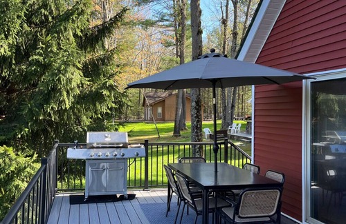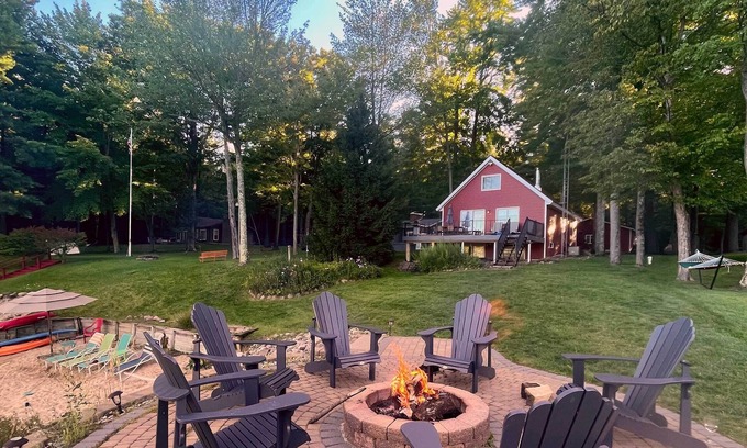 The cottage is in the perfect location on the lake, tucked in a slight cove with a sandy beach and unique fire-pit overlooking the water, and ready for relaxing with 6 Adirondack chairs. Wake up to glass-calm waters and take in the view with your morning coffee (coffee pods and tea provided). Be sure to curl up next to the crackling wood fireplace, while cozying up to watch a movie, play games or enjoy the moon glistening over the lake. You'll find a variety of fun board games, a full poker set, activity books, coloring books, stickers, blocks, and puzzles. Also equipped with (3) smart TVs and high-speed internet. The lower level has a large sectional, DVD player, and 55" flatscreen with surround sound so you can have a memorable movie night with the whole family. For those who need to get a little work done we’ve got a space for that too. Equipped with a desk, ergonomic chair, keyboard, and monitor with HDMI cord (second monitor available if requested). Enjoy preparing meals together in the large kitchen, with modern appliances, granite countertops, and a large kitchen island. A quiet, peaceful sleep awaits in the four sleeping areas with nearly all new Casper mattresses, soft linens, and extra blankets. Two full bathrooms, one sits right off the main floor bedroom and another next to the built-in bunk bed on the lower level, creating a private sleeping quarter for kids or adults. The first floor and lower floor walk out directly to the lake so keeping an eye on kids or running back to grab a drink or extra beach towel is no problem at all. Finally, the large deck, equipped with a gas BBQ, dining for 6, and 3 additional lounging chairs is the perfect place to take it all in.
