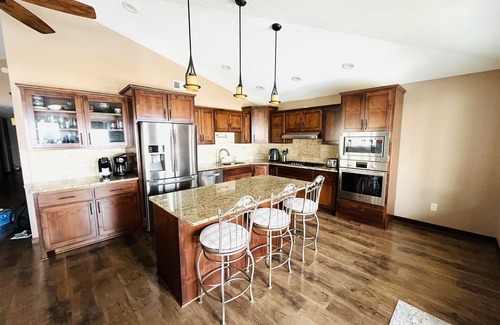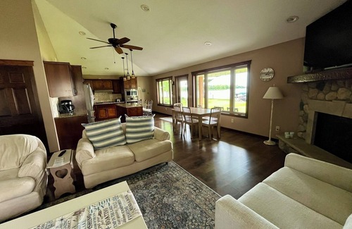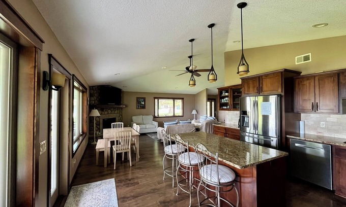 Located on the golden sand beaches of South Lake Mille Lacs, Sandy Bottom features stunning panoramic views of the clear blue lake and endless opportunities to enjoy “lake life”. Tucked in the safety of Isle Harbor Bay between Father Hennepin State Park to the west and the public beach at the town of Isle’s Lakeview Park, the property boasts a private beach, boat dock, swimming area, and fire pit. The newly furnished 3-bedroom 2-bathroom single family residence sleeps up to 8 adults, with king, queen, and bunkbed bedrooms, ample storage, and a third mirrored sink located in a laundry room with free-use commercial washer/dryer. Spacious open concept family and kitchen areas offer stunning views, a large center island, seating for 15 people and a new twin memory foam sofa sleeper. Central wireless internet and a large internet connected OLED TV is present above the stone fireplace. Another internet-connected TV is provided in the third bunkbed bedroom. Custom built in 2015, this single level lake home has modern stainless-steel appliances, granite counter tops, and comes fully stocked with dishes, cookware, and eating utensils. A lakeside covered patio and lawn offer opportunities for campfires, lounging, outdoor grilling, picnicking, stargazing, and just relaxing.