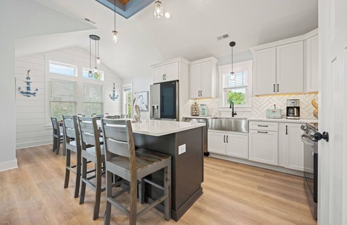 With the popular beach plan layout, the Great Room on this level has several areas designed for relaxation: a large sectional and two armchairs in the living area plus a Ships Watch that offers a poker table with four chairs. The dining table seats 10 and the kitchen island seats 4. The kitchen has plenty room for preparing family meals; and is equipped with two ovens. There is deck access to the front and back of the house for sunning and relaxation. Enjoy outdoor dining on the table and six chairs located on the back deck. The first of four King Master Suites is located on this level with a tiled shower in its master bath. This bedroom has private deck access with furniture.
