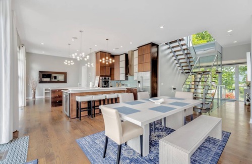 The interior of the house has a very modern feel. The main level has a fully stocked beautiful kitchen with an ample island and plenty of seating for everyone with living space that opens out to a deck with seating and grilling options and a hot tub for relaxing.