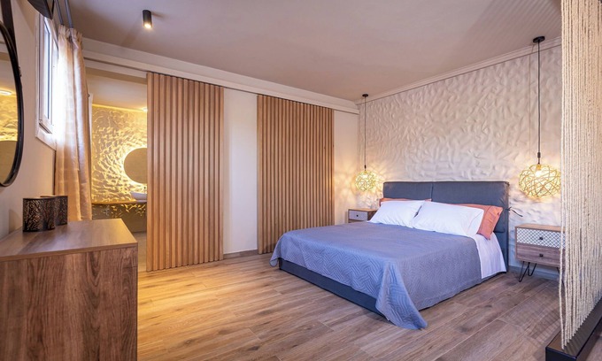 The Sandy Suite near Ipsos Beach, offers luxury moments in a spacious one area bedroom with living - dinning room. For extra relaxation it features hot tub in a large bathroom! The apartment is brand new and decorated with minimal style and artistic texture wall which imitates a sandy seabed. The atmosphere will rejuvenate your spirit and soul.