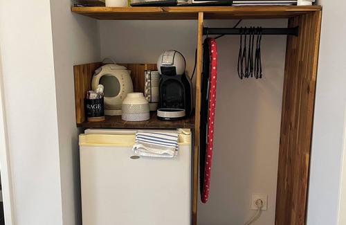 TV, fridge, microwave, coffee machine, tea, chocolate, kettle