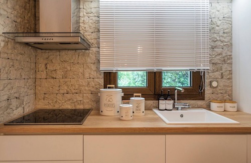 The villa’s outdoor area is a true oasis: a lush garden with a rockery, blooming herbs and flowers, a barbecue for summer flavors, comfortable garden furniture, ping pong table, garden football goal, sun beds, and access to the complex’s shared swimming pool for refreshing dips whenever you wish.