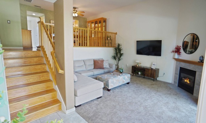 Stay comfortably in Stevenson Ranch at this 2-bedroom (plus large loft) townhome. This amazing property features 1 queen bed, 1 full bed, a loft with 2 queen-size blow-up mattresses a pop-up sofa bed, and 2 bathrooms. Guests can enjoy high-speed Wi-Fi, AC/Heat, 50" Smart TV's, Desk, Complimentary start up coffee/tea bar, toiletries, well-appointed kitchen with Keurig Coffee maker, toaster, blender, microwave, plus all necessary dishes, glass ware, pot and pans, baking trays, mixing bowls and more, iron with full size ironing board, and a washing machine and dryer during their stay. This property is minutes away from Magic Mountain and Hurricane Harbor. A few miles from The Cube, Ice Skating Rink, Valenica Town Center Mall and Downtown Newhall. Enjoy all Santa Clarita Valley has to offer with its fine dining, Micro Brews and Wine Bars. If you love the outdoors, you'll also enjoy our miles of walking and bike paths and numerous trails.