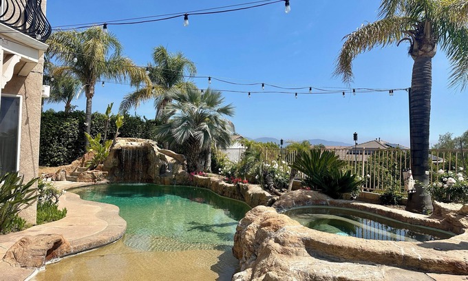Tropical Setting where you can gather with friends and family. This is a family environment. Beach entrance Pool with Slide, Jumping Rock, Grato, and Large Jacuzzi. Outdoor lounging and eating areas. Outdoor BBQ with island. Firepit. Bonus room with theater & couches that seat 8-10. Large kitchen with open island. Pool table, foosball. Close to Magic Mountain, off Copperhill. Fireworks can be seen all over the valley during 4th of July from the balcony and backyard.