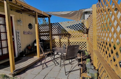 This is a cute studio cottage with a full bath and cold air condition. A pretty outdoor area, private driveway, private parking, secluded yet only minutes to town. Santa's little cottage is cozy and bright!