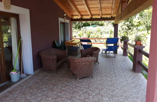 Comfortable three-room apartment surrounded by orchards and vineyards with a large veranda equipped with table, chairs, deckchairs, reserved parking space