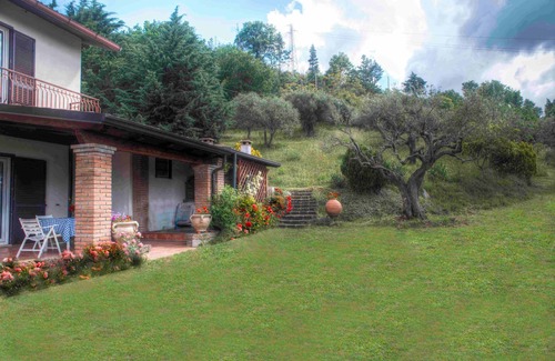 Villa Adagiata su un promontorio circondata da un uliveto, isolata e tranquilla, circondata dal verde. La posizione dona un panorama fantastico tra vigneti e uliveti di fronte al monte Tuoro (1400m)
