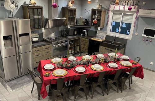 American kitchen with high-end equipment: piano cooking, dishwasher, microwave, American fridge with water + ice cubes, large table and 12 armchairs.