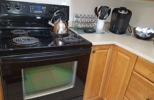 KITCHEN: The updated and fully equipped kitchen provides the ability to prepare your own home cooked meals. This kitchen features an electric stove. There are plenty of pots, pans, cooking utensils and dishes provided that let you get right down to creating your feast. Although compact, this efficient space offers a full sized fridge and stove; in addition to smaller appliances like coffee maker, microwave and toaster. ADDED BONUS - the built in dishwasher makes clean up a breeze.
