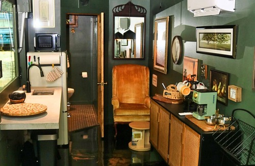 The Sassafras is a romantic dream with its bold jewel toned decor and cozy vibes. There is a comfortable loveseat couch, a reading corner, and 3 outdoor seating areas. The bedroom has a luxurious queen size bed, plenty of storage, and a private patio. The kitchenette is equipped with a hot plate, toaster oven, Keurig, cooking utensils, plates, cups, bowl, and everything you need for an amazing stay. The bathroom features a double headed shower and light up mirror. The kitchen area has a lovely automatic window that opens the space up to the main outdoor porch. There is a fire pit with perfect river views. You will find the Sassafras Container Tiny Home has everything you need for a perfect stay!