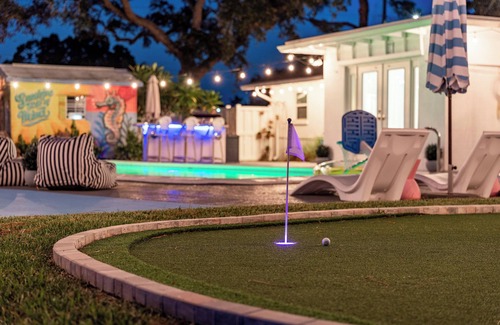 Luxury Family Retreat–15 Mins to Beach. Dive in the heated pool with disco lights, serve on your own pickleball court, or play glow mini-golf. Enjoy the movie theater and arcade with fresh popcorn. Relax by the gas fire pit, fire up the BBQ, and sleep soundly in 3 king bedrooms and comfy bunks (sleeps 12). A chef’s kitchen, 6 smart TVs, and beach gear keep everyone entertained. The backyard oasis glows at night with yard games, outdoor movies, and a kid’s swing set. Pet-friendly—bring your pups!