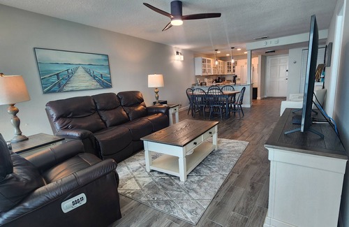 Newly remodeled top floor condo with direct facing ocean views. Morning coffee and sunrises are a must, from this east facing screened balcony. This 8th floor unit has been remodeled with updated floor plan, in 2022. The master suite has king bed , large walk in closet, private bathroom with shower with windows and balcony access over looking the ocean. The second bedroom has two queen beds and a large closet, matching dresser with quick access to the second bathroom and linen closet.