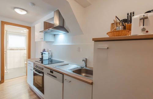 "Sattlerweg", 2-room apartment 50 m2, on the ground floor. Object suitable for 3 adults. Modern furnishings: entrance hall. 1 double bedroom. Living/sleeping room with 1 sofabed (130 cm, length 190 cm), dining table and satellite TV (flat screen), radio. Exit to the terrace. Open kitchen (oven, dishwasher, 4 ceramic glass hob hotplates, toaster, kettle, freezer, electric coffee machine, Capsules for coffee machine (Nespresso)). Shower/WC. Small terrace. Terrace furniture. View of the resort. Facilities: Internet (WiFi, free). Please note: non-smokers only. Smoke alarm. 50402-000629-2020