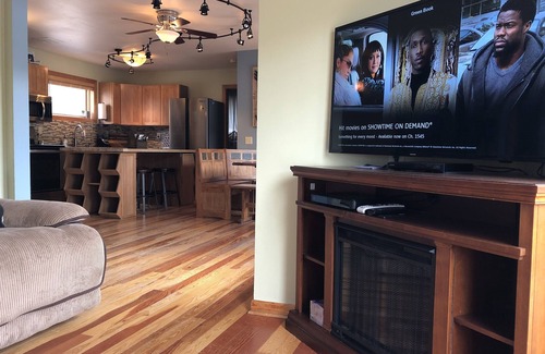 The fully-stocked gourmet kitchen features natural finish cabinetry and granite counters. Included are pots, pans, toaster, microwave, Keurig coffee maker, blender and instant-pot, cooking utensils and some seasonings. We will leave you a dozen of our favorite K-cups, but feel free to bring your own stash of coffee and seasonings as well!