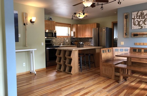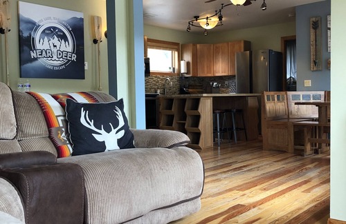 Near & Deer’s cozy spaces and rustic artwork adorn this tastefully decorated three bedroom, two bath waterfront cabin.