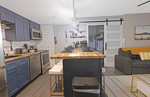 When it’s time to hit the sack, head to the fresh and chic bedrooms, with a balance of retro and modern. The master bedroom features a queen bed with an electric fireplace, and a modern en suite bathroom. The second bedroom, also with a modern en suite bathroom, is on the opposite side of the property, has a queen bed, a queen over double bunk bed, and a desk for all your computer needs.