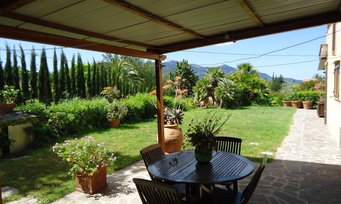 (Text automatically translated) Ground floor apartment, sea view, garden with table and chairs, outdoor dining terrace.
