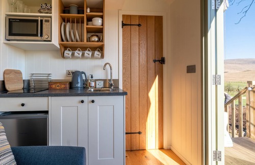 Scalderskew Shepherds Hut is a modern hut with underfloor heating and plumbed-in facilities, situated in a quiet space on a traditional working hill farm in the stunningly-beautiful Western Lake District.