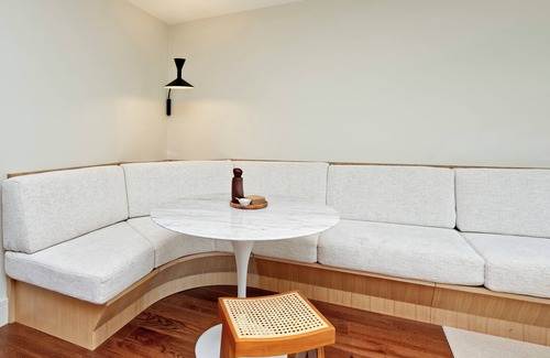 The home’s neutral, contemporary style includes a hand-built banquette seating area in the lounge, wood panelling, and soft cream accessories. Generous natural light enhances the open-plan layout, while the thoughtful design ensures comfort and style in equal measure.