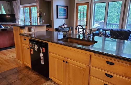 Our home is architect-designed with lots of cozy nooks in the spirit of the Not So Big House book by Sarah Susanka. The main level has a large kitchen with gas stove, two dining tables, a kitchen counter that seats 5, and a cozy family room with a wood-burning fireplace. The basement is designed in an Old World European/Scandinavian theme and has a pool table, wet bar, game table, big-screen TV and a gas fireplace styled like a wood-burning stove.