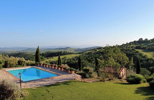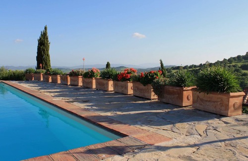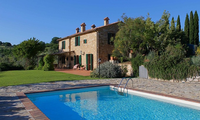 Scansano Country House is an ancient charming stone house located in the heart of Maremma, the southern area of Tuscany, Italy. The villa is set on a gentle hill just a couple of kilometers from an enchanting village called Scansano, well known for its Morellino di Scansano, one of Toscana's most prestigious wines. The house's stunning view stretches from Capalbio to Monte Argentario and Orbetello Laguna. Inside, the traditional beamed ceilings and terracotta floors are highlighted by lovely paintings. A paved terrace with tables, chairs and comfortable loungers surrounds the house. The terrace is immersed in an amazing Mediterranean garden with a unique swimming pool. The property (27 acres) lies within a working farm estate producing first quality olive oil.