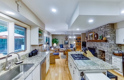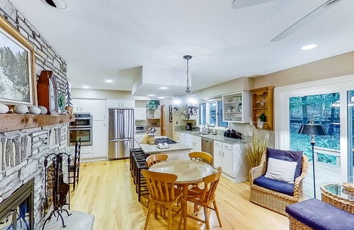 Enjoy Northern Michigan in this well-equipped and comfortable home situated on the edge of the woods with downtown Harbor Springs five minutes away. This home has views of a pond and Lake Michigan from the combined living/dining room, which also features a flatscreen TV and a two-sided granite fireplace. The covered front deck is perfect for lounging, dining, watching the sunset, and enjoying a drink. The back deck offers privacy, a dining area, as well as chaises for tanning. The open-concept kitchen features another flatscreen TV and enjoys the benefits of the other side of the stone fireplace and floor-to-ceiling windows overlooking the woods.