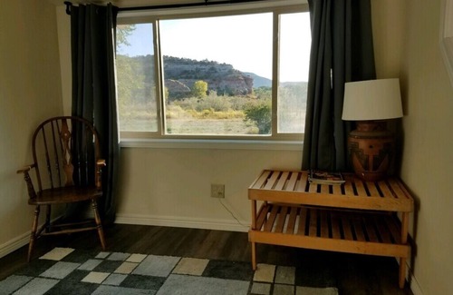 Keywords: Cabin, large shaded porch, red rock canyon views, creek, hiking.