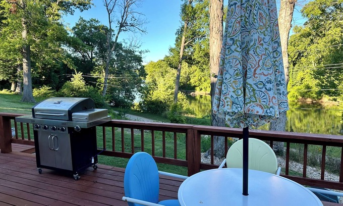 Cozy 2 bedroom home with large front deck and fire pit facing the White River. Cottage has large front porch and outdoor area on a hill for expansive river views. New deck added on river bank for fishing and steps for water access. Large yard has plenty of room for lawn games or activities. Includes washer and dryer, games, puzzles, darts, and a bumper pool table.