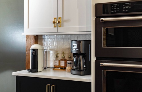 Enjoy picturesque views of the farm and rolling hills through the large picture window framing the cast iron sink. And for the perfect start to your day, the kitchen boasts a fully stocked coffee bar featuring a 12-cup drip coffee maker, a Nespresso machine, flavored syrups, creamers, sweeteners, and a variety of coffee and tea options.