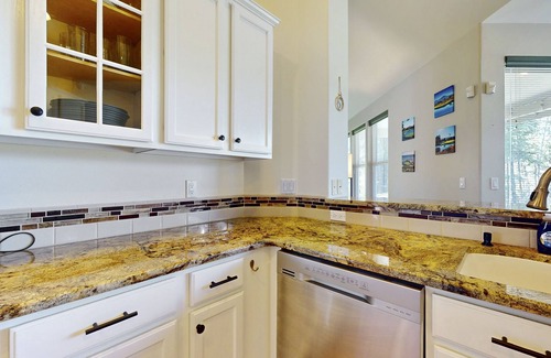 Inside, vaulted ceilings, hardwood floors, and oversized windows bring in natural light and forested views. The kitchen features granite slab countertops and an inviting eating bar, making it perfect for post-round meals or relaxed entertaining.