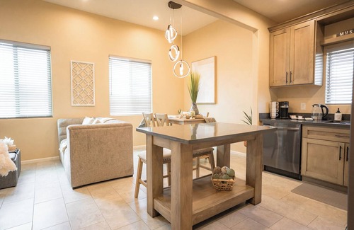 Our casita boasts a fully equipped kitchen, complete with modern appliances, so you can easily prepare your favorite meals and snacks. The dining area is ideal for enjoying leisurely meals together, making you feel like you're dining in your own home.