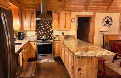 Your stay at this stunning ranch guarantees comfort and luxury with multiple amenities designed for relaxation and enjoyment. Featuring two adjacent homes, the primary house accommodates up to 10 guests with three bedrooms and two full baths, while the secondary cabin has two additional bedrooms. The extensive outdoor living area boasts a private pool, fire pits, scenic overlooks, and a breezeway connecting both homes, ensuring privacy yet accessibility for guests. Gather around the gas grill or challenge friends to games like cornhole or basketball to create unforgettable memories between wedding festivities.